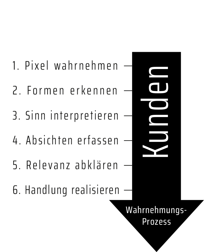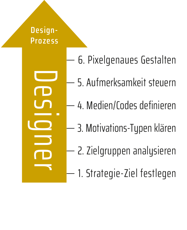 Kunden nehmen zuerst wahr, verarbeiten dies dann kognitiv und reagieren zuletzt (hoffentlich richtig). Designer müssen genau gegenteilig denken und gestalten: Zuerst muss das Ziel eindeutig definiert werden. Dadurch wird erst klar, welche Zielgruppe dafür mit welchen Medien erreicht werden soll. Schließlich wird im Medien-Design die Aufmerksamkeit konkret gesteuert, um das Verstehen zu garantieren. Nur was wahrgenommen wird, kann wirken. Und nur was verstanden wurde, kann die richtige Wirkung entfalten.
